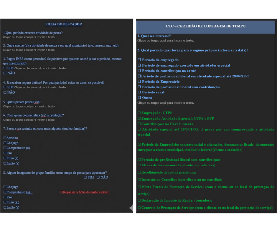 O advogado, o bacharel ou o estudante de direito teria à mão Fichas de Atendimento prontas, indicando exatamente quais provas são necessárias para cada benefício, para cada cliente, na hora do atendimento.